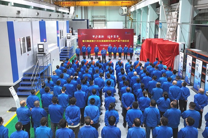 下線儀式上,馬旭耀董事長(zhǎng)與全國(guó)勞動(dòng)模范、公司勞模代表侯海峰共同為第31萬(wàn)臺(tái)高端數(shù)控機(jī)床揭幕。